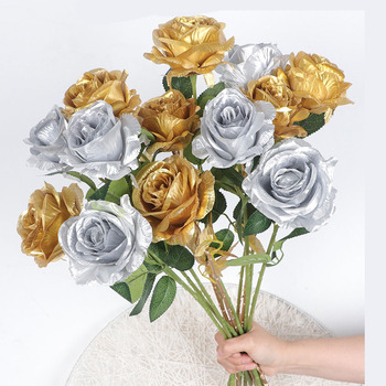Arreglo de flores de rosas de oro y plata hecho a mano para Pascua, simulación transfronteriza, decoración de fiesta de Acción de Gracias, rosas únicas